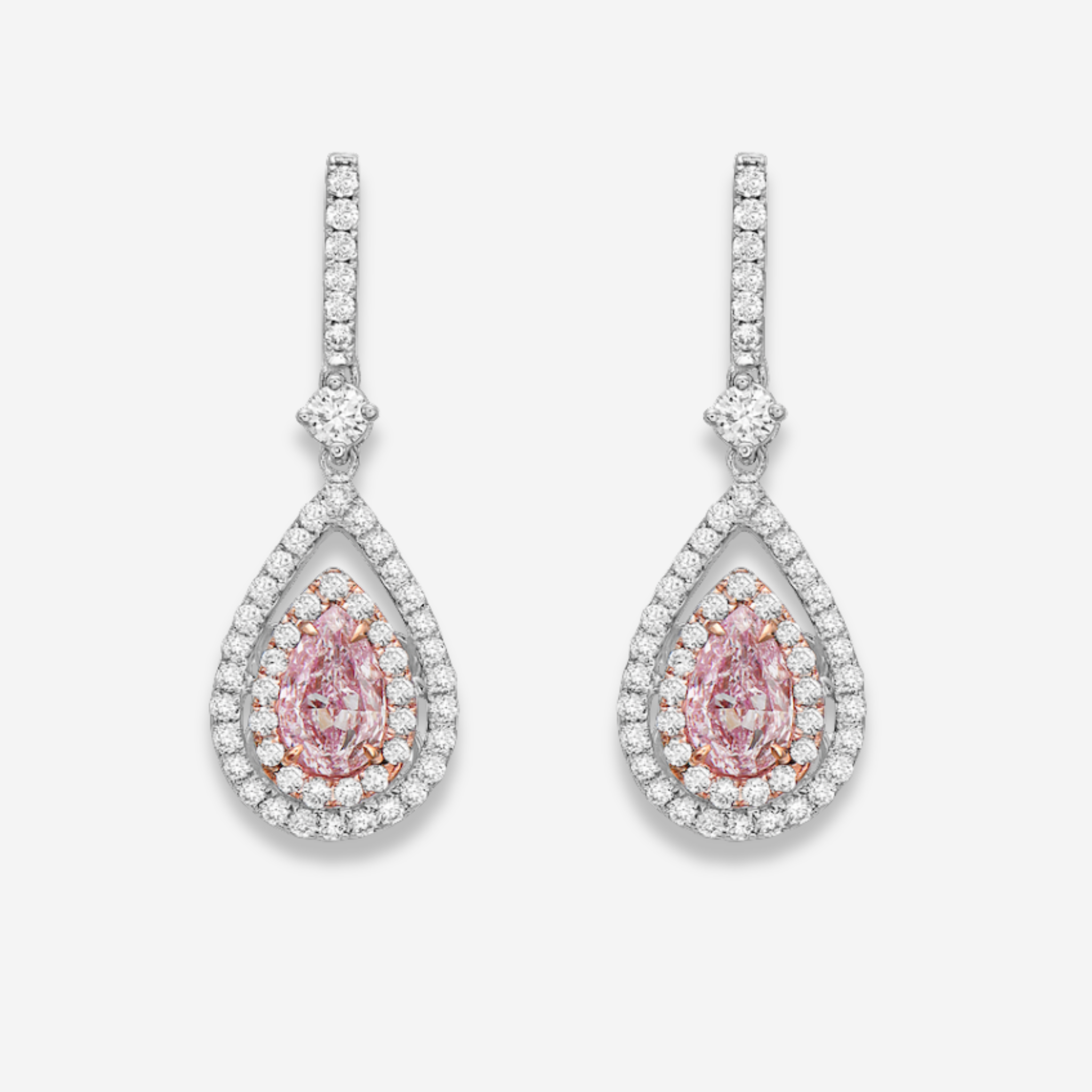 pink diamond pear shape earrings with white diamonds. Pink diamond earrings