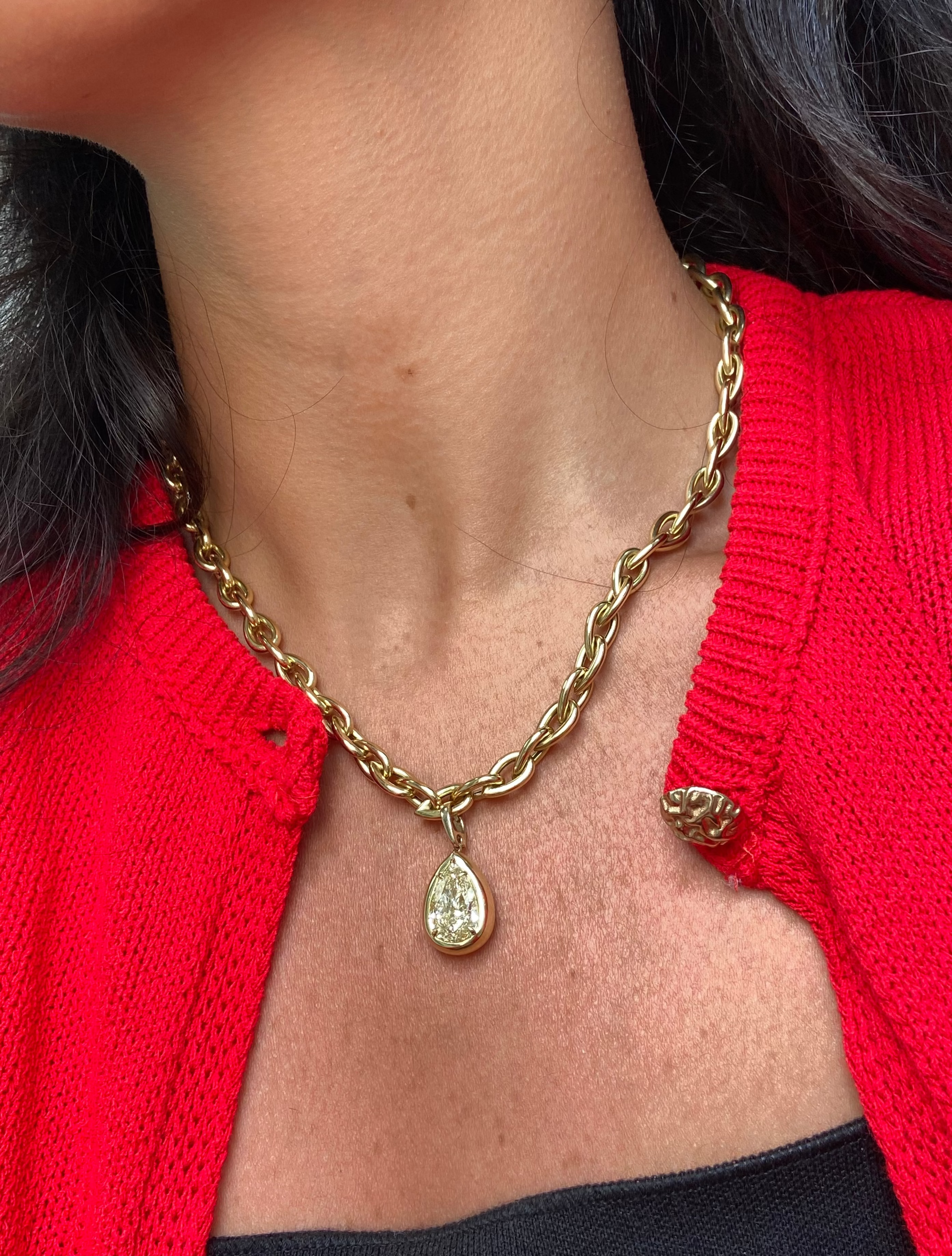 This stunning statement pendant adds instant polish to any necklace stack—subtle yet bold in all the right ways. At its center is a light yellow pear shape diamond, bezel set for a sleek, modern finish. A refined pop of color that feels both effortless and unexpected, it's the perfect everyday piece with just the right edge.