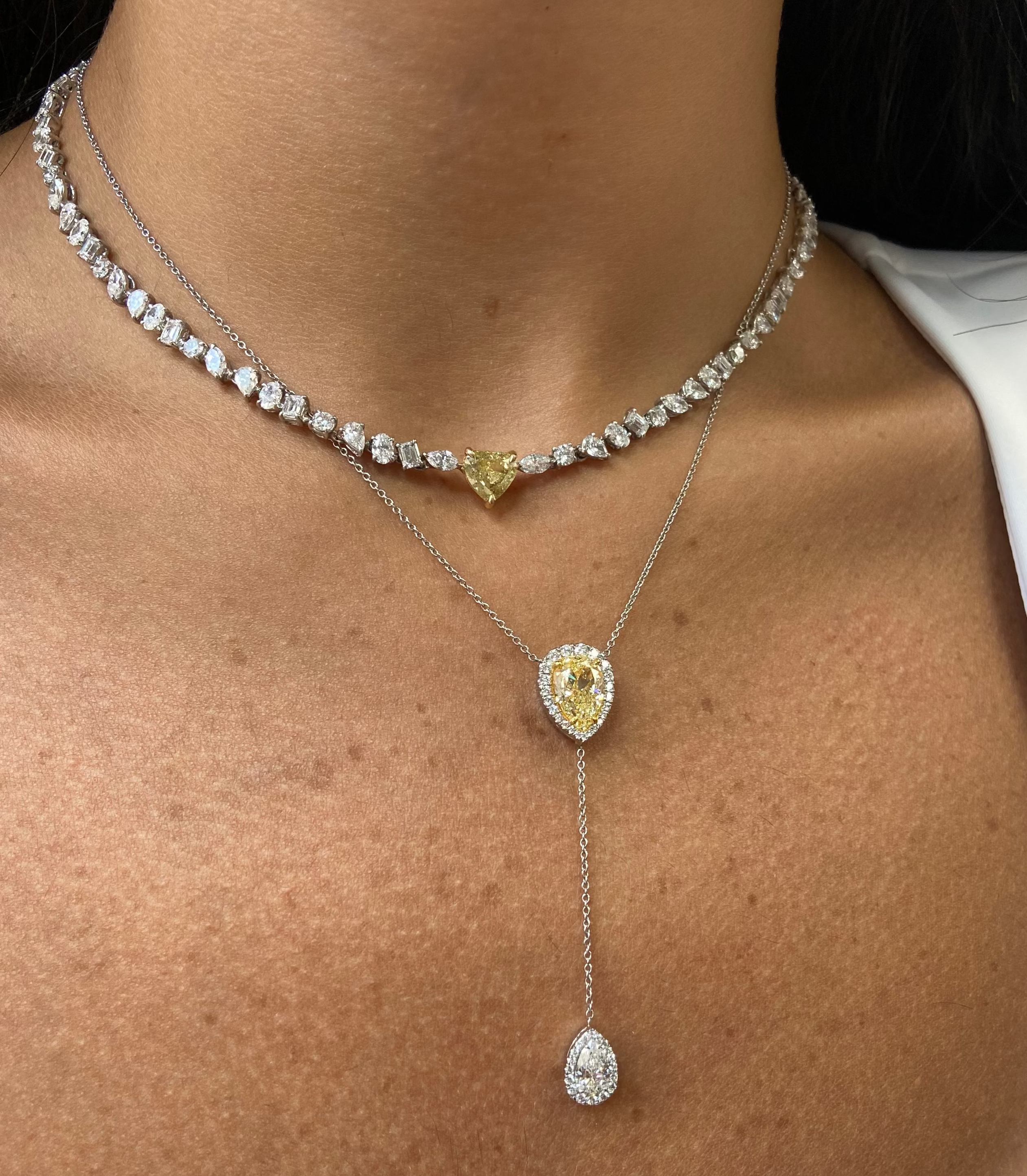 Effortlessly elegant and quietly bold, this lariat necklace features a 3-carat light yellow diamond that glows with warmth, accented by a white diamond that gracefully hangs at the drop. The delicate silhouette and unexpected color contrast make it the piece you’ll reach for more than you expect—and wonder why it took so long to find. Understated luxury at its finest.