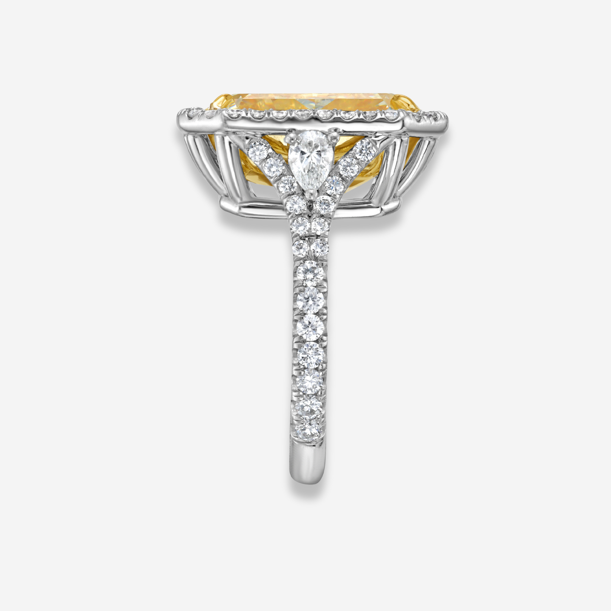 A 7 Carat GIA Certified Light Yellow Elongated Radiant Cut diamond ring, in a white diamond halo design, surrounded by pear shape accent diamonds in this exquisite handcrafted ring.