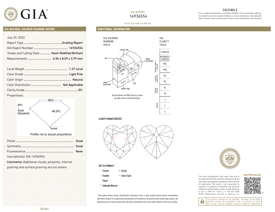 This 1.37ct GIA light pink heart shape diamond features an exquisite and rich pure pink color. Its handmade platinum design with diamonds make it an excellent choice for an elegant and romantic showpiece.