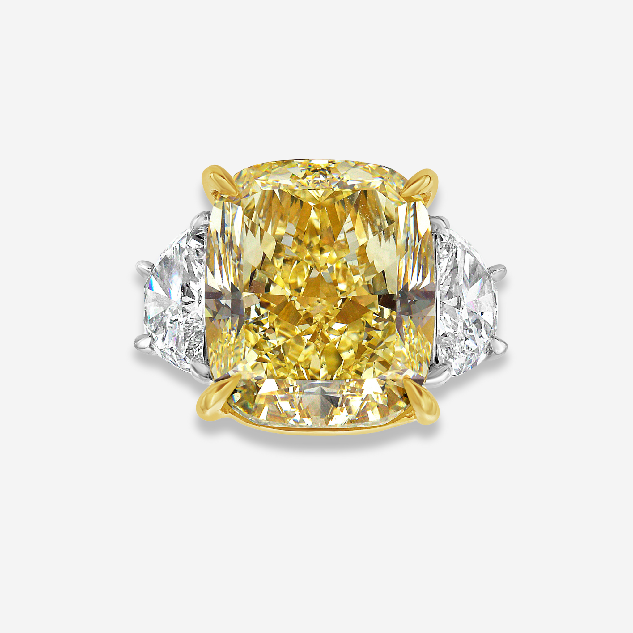 A GIA certified diamond ring with a 15 Carat Internally Flawless Fancy Yellow center elongated cushion cut diamond center. Featuring Excellent, Excellent cutting. Enhanced by 1.60 Carats of E VS+ Half Moon sidestones. This ring was handcrafted in NYC and is set in 18k yellow gold and platinum.