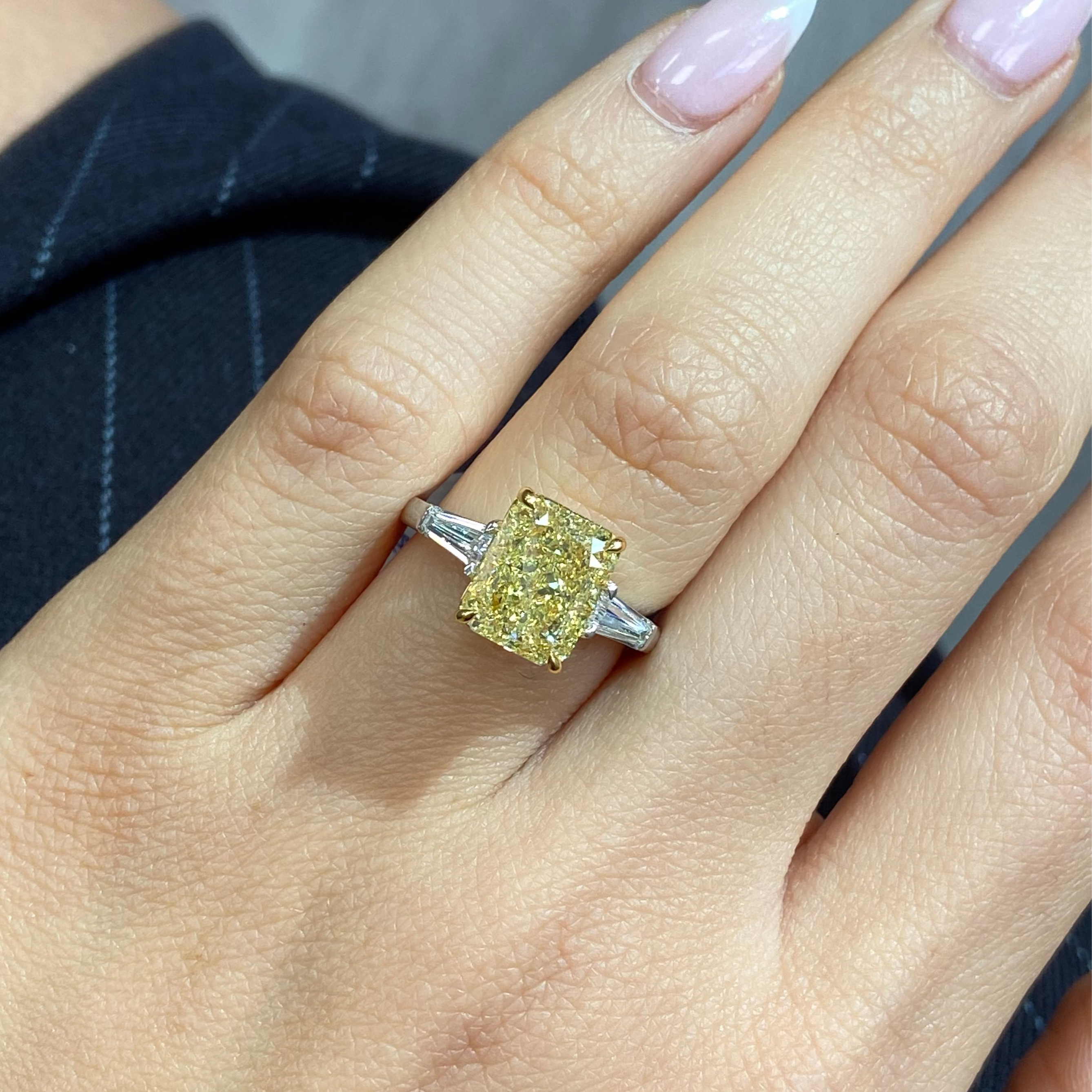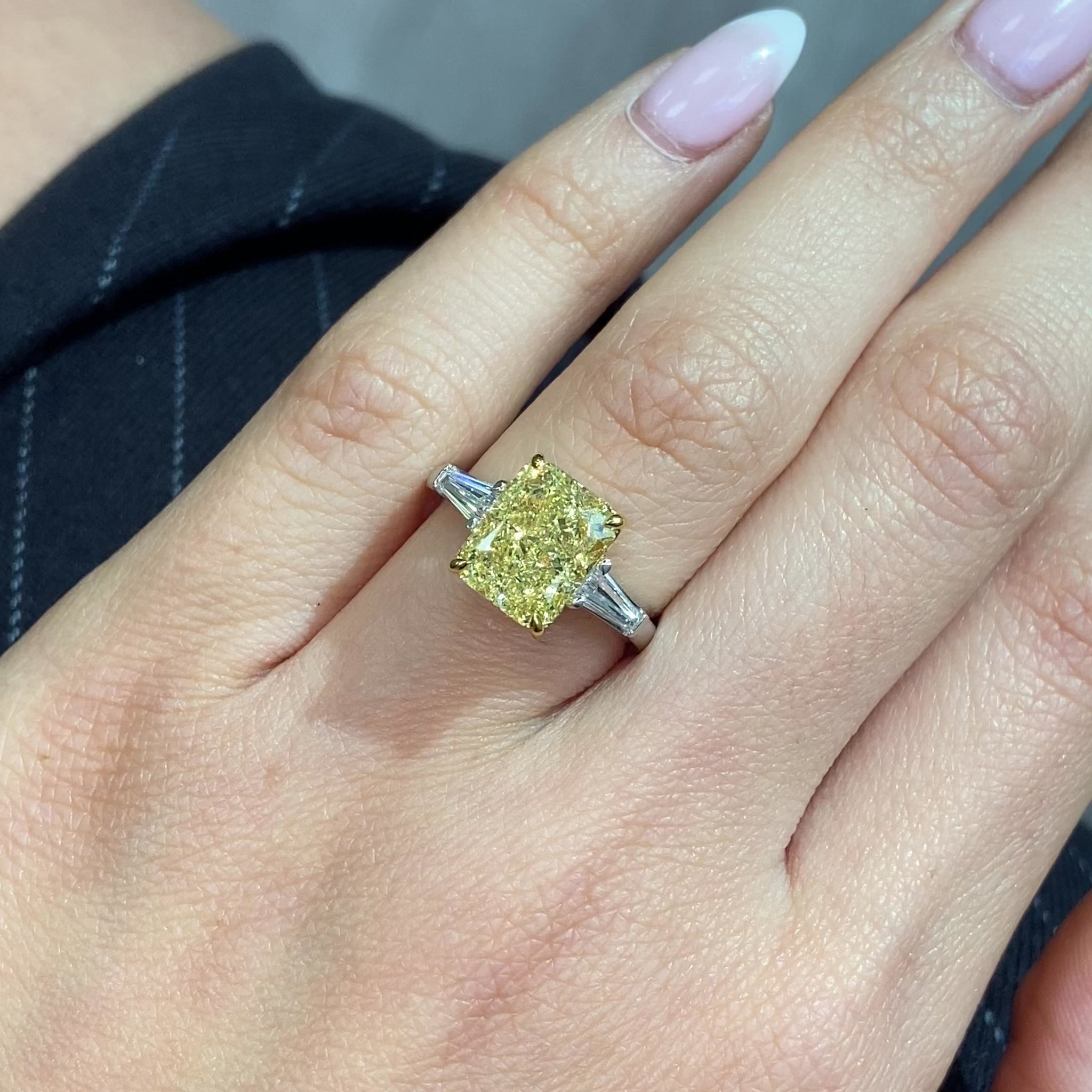4.00 Carat GIA Fancy Yellpw Elongated Radiant Cut Diamond Three Stone Engagement Ring with Tapered Baguette Sidestones