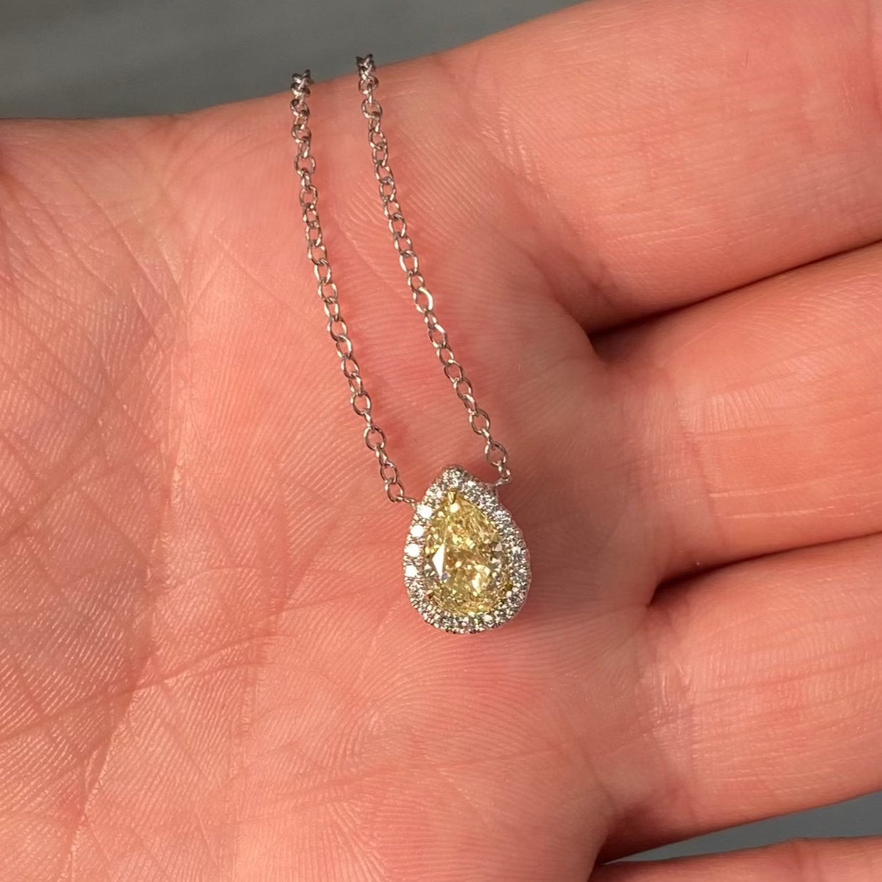 Simple yet elegant yellow diamond pedant that would compliment anyones collection. 1 Carat carat natural fancy light yellow pear shape diamond. Set in 18 karat gold with classic halo. Handmade in New York City.