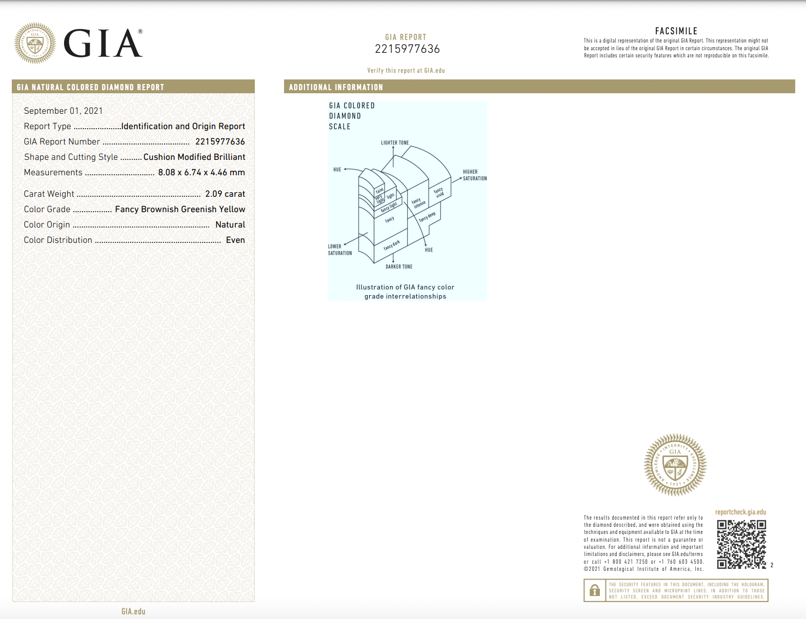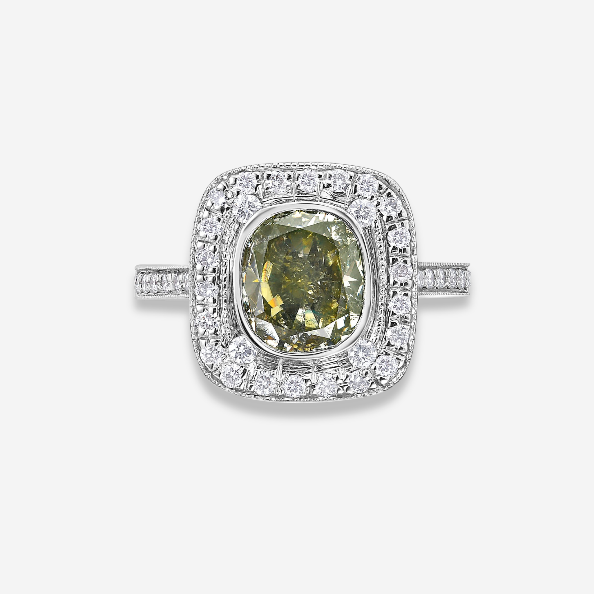 2.09 Carat Center Diamond Fancy Brownish Greenish Yellow Cushion Cut Diamond Handmade in NYC Handcrafted in 18k White Gold