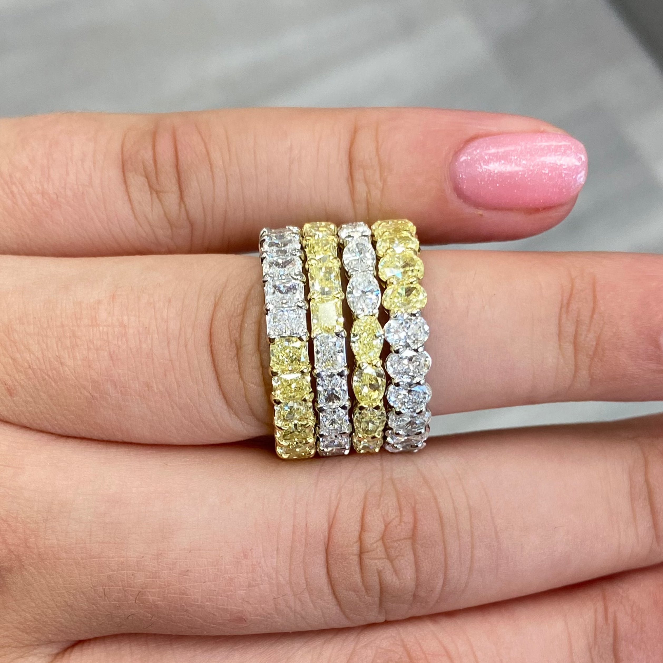 This stunning eternity band features a unique design with half of the band adorned in yellow diamonds and the other half in white diamonds. The diamonds are set in a secure prong setting, showcasing their brilliance and fire. Perfect for giving you two styles in one ring.