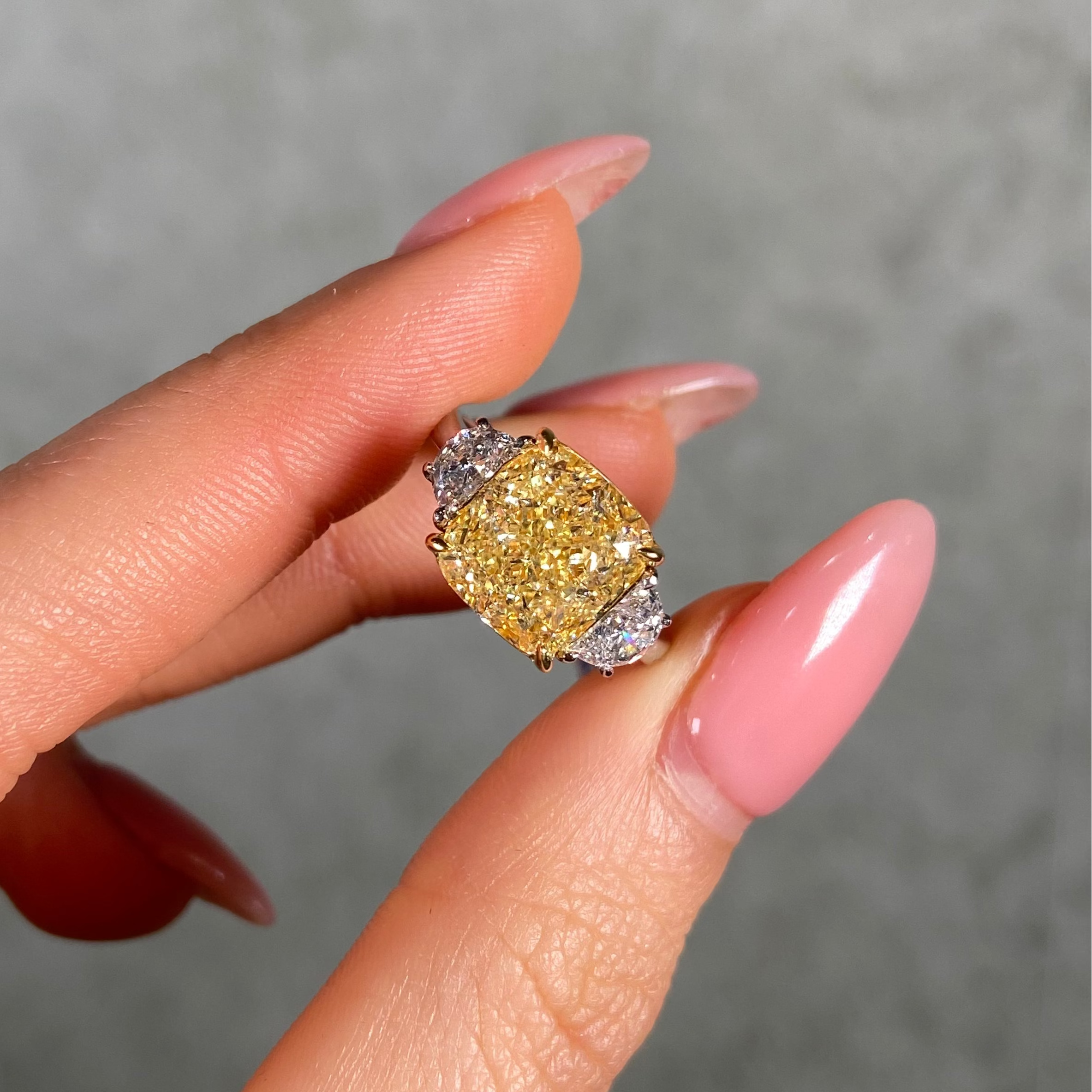 5.04 Carat Fancy Light Yellow Cushion Cut Diamond Three Stone Engagement Ring