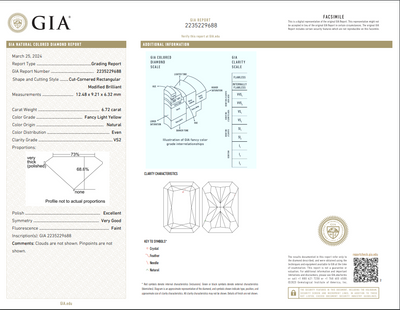 A GIA certified diamond ring with a 6.72 Carat Fancy Light Yellow center elongated radiant cut diamond center. Featuring Excellent, Very Good cutting and VS2 Clarity. Enhanced by 1.00 Carat D VS+ Epaulette sidestones. This ring was handmade in NYC and is crafted in 18k gold and platinum.