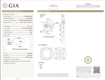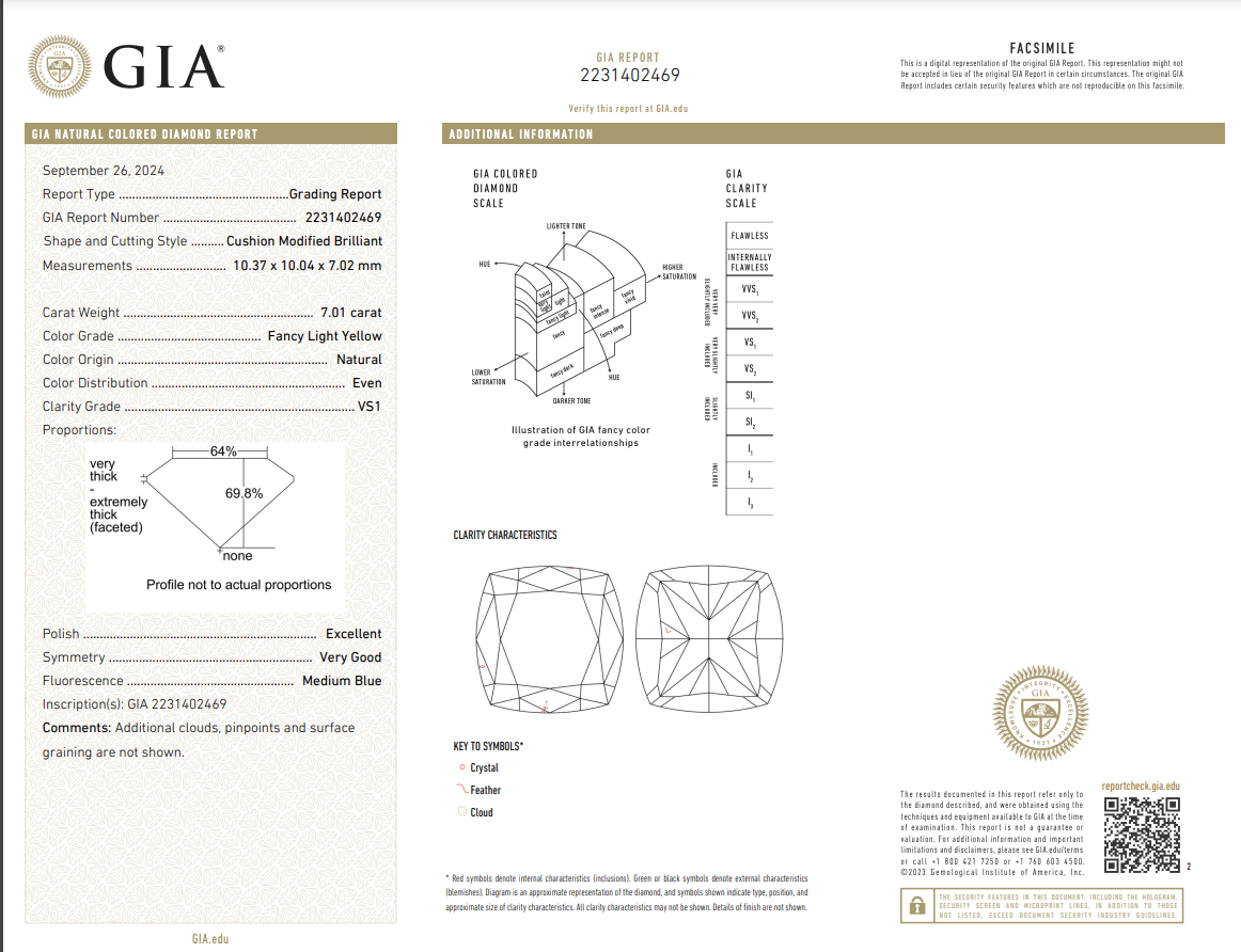 A 7.01 carat Fancy Light Yellow cushion cut diamond takes center stage, its soft hue elevated by the precision of VS1 clarity. Framed by 0.54 carats of E color VVS2 epaulette side stones, the composition highlights contrast while preserving a graceful balance. GIA certified and crafted in platinum and 18k, this ring is handmade in New York City, reflecting the Rare Colors philosophy of rarity expressed through timeless design.