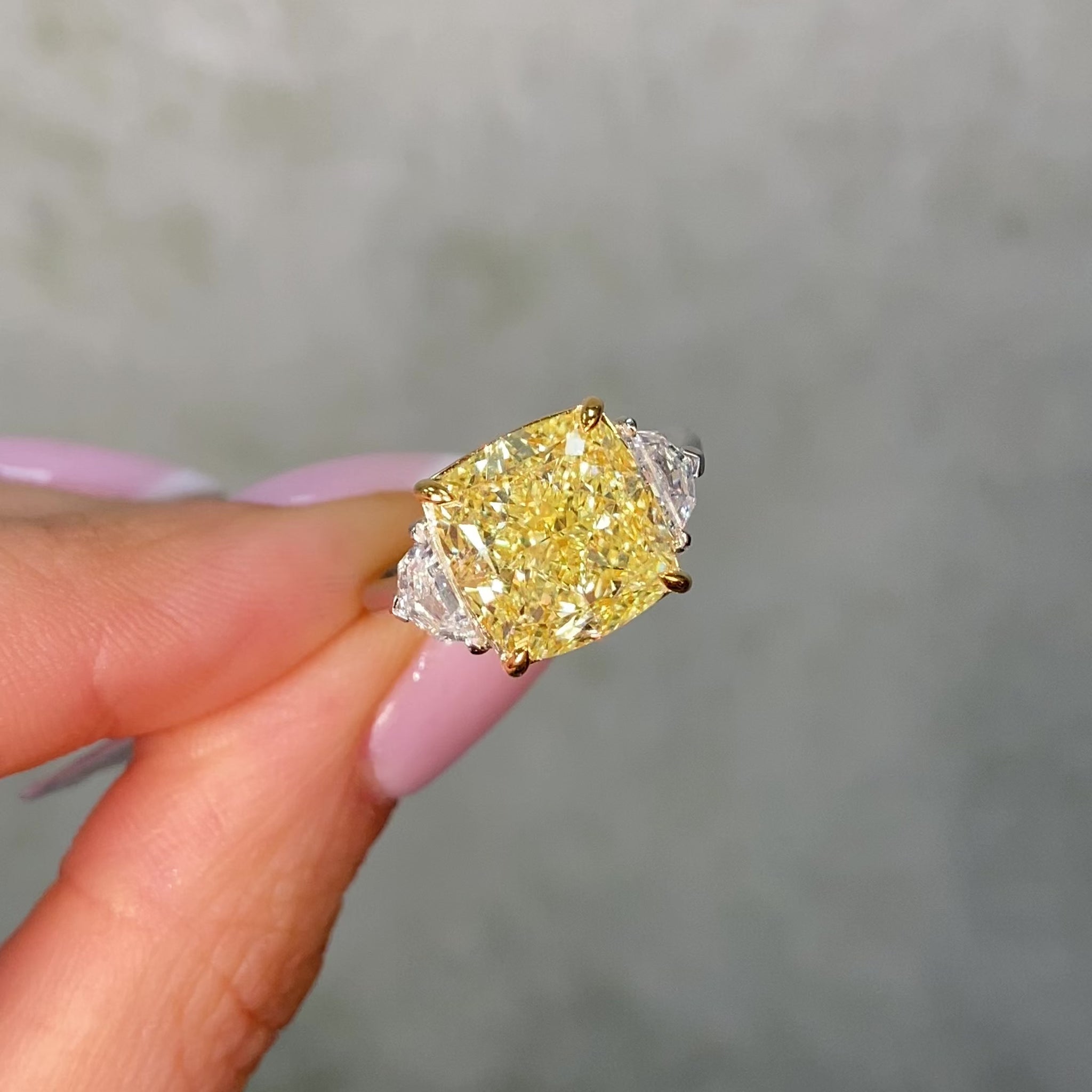 A breathtaking 7-carat Fancy Light Yellow Diamond engagement ring, featuring a perfect square cushion cut that radiates a soft, timeless glow. Set in our classic three-stone design with half-moon side diamonds, it captures light from every angle — elegant, refined, and unmistakably rare. Handcrafted in New York City by our master jewelers, this ring celebrates the natural yellow hue and inner brilliance of a truly extraordinary diamond.