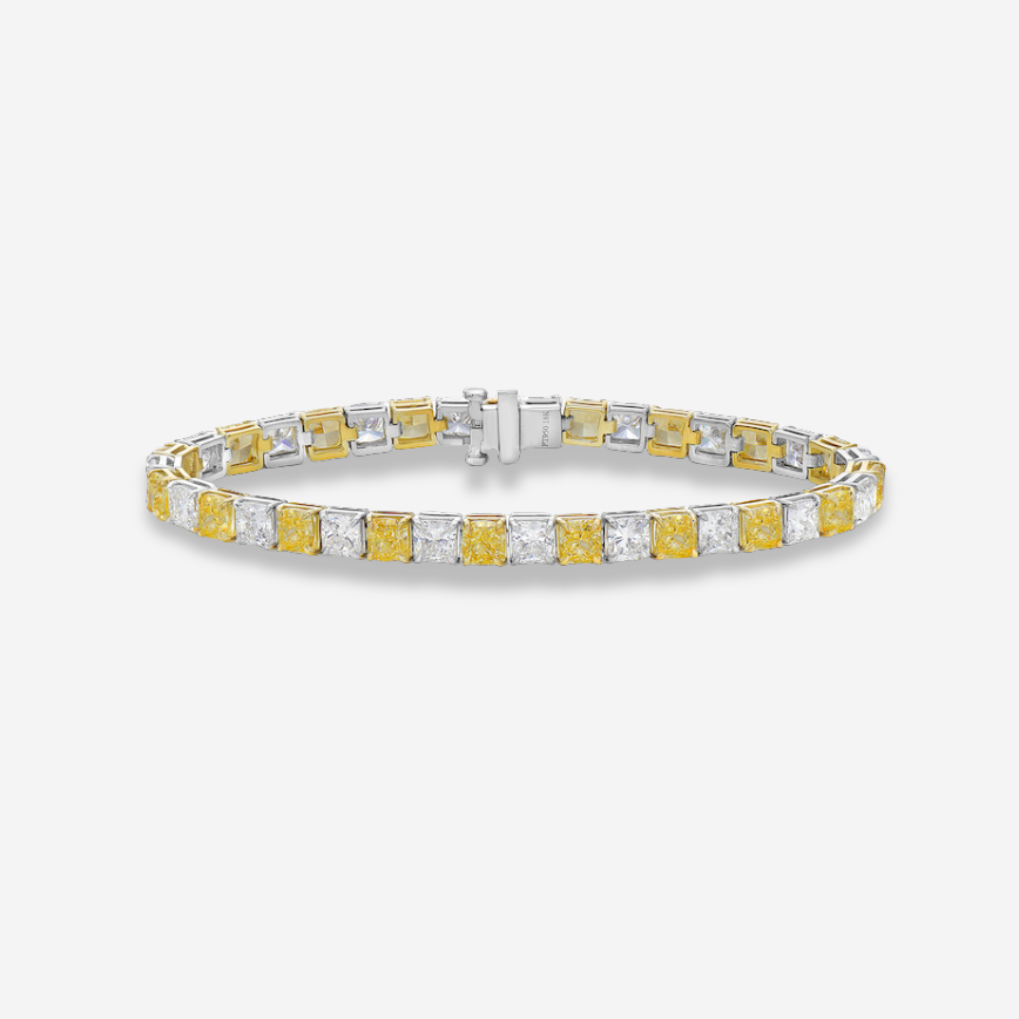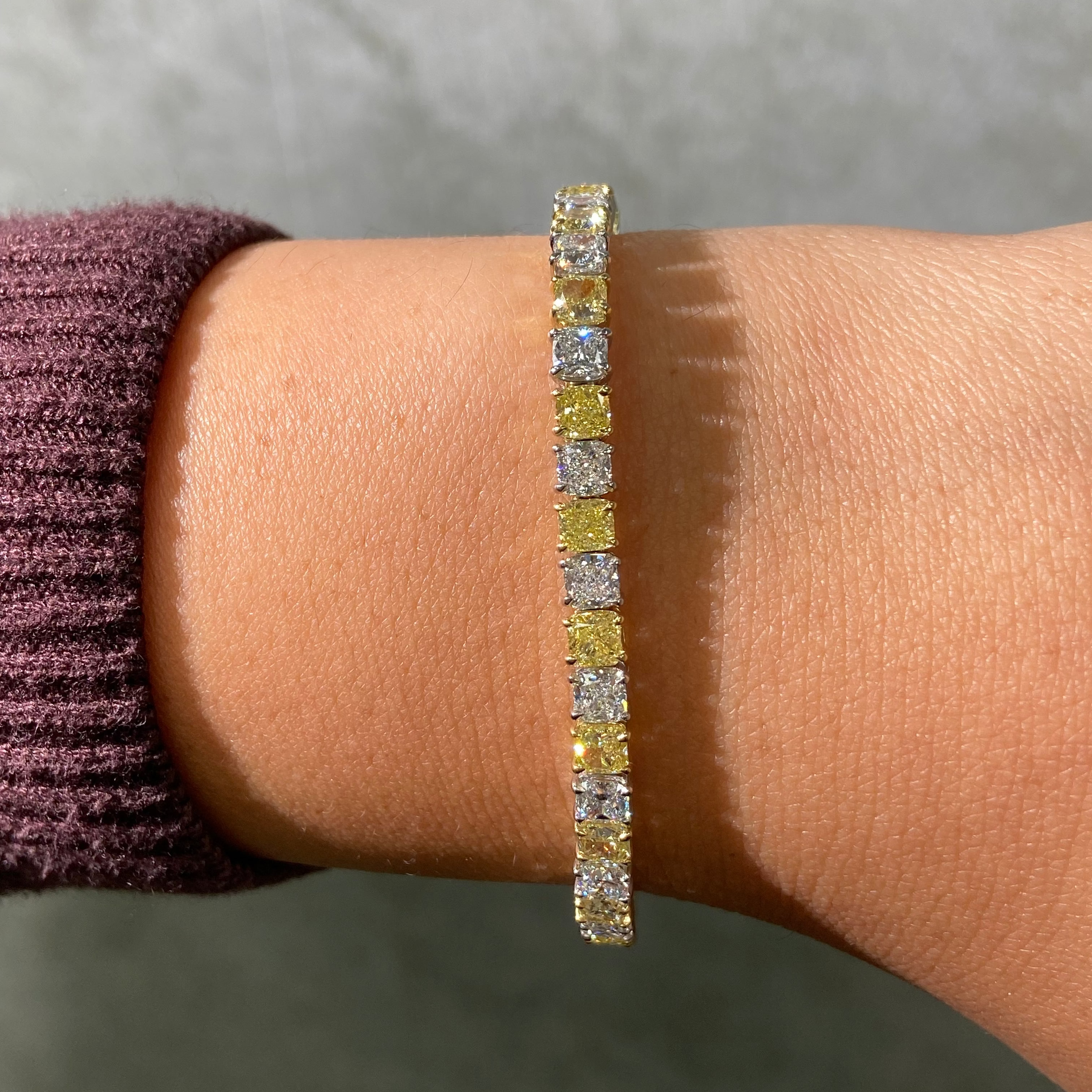 This alternating yellow and white diamond tennis bracelet is a study in contrast and balance. Featuring 11.06 total carats of square cushion cut diamonds, it pairs 6.03 carats of fancy yellow diamonds with 5.03 carats of D E colorless diamonds for a striking yet timeless rhythm of color.