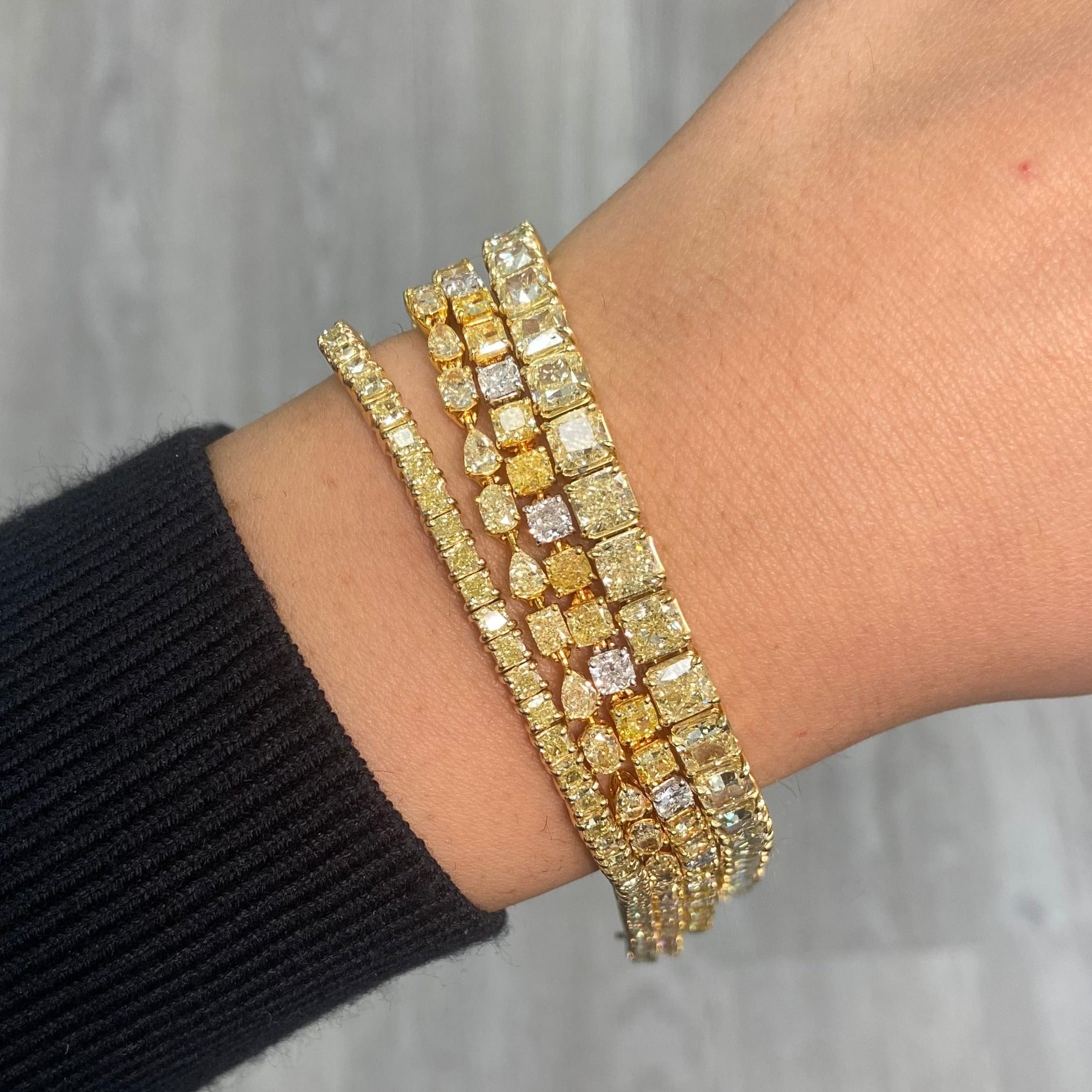 A 7.43 Carat yellow diamond tennis bracelet, handmade with Fancy Yellow cushion cut diamonds, all in VS-VVS Clarity