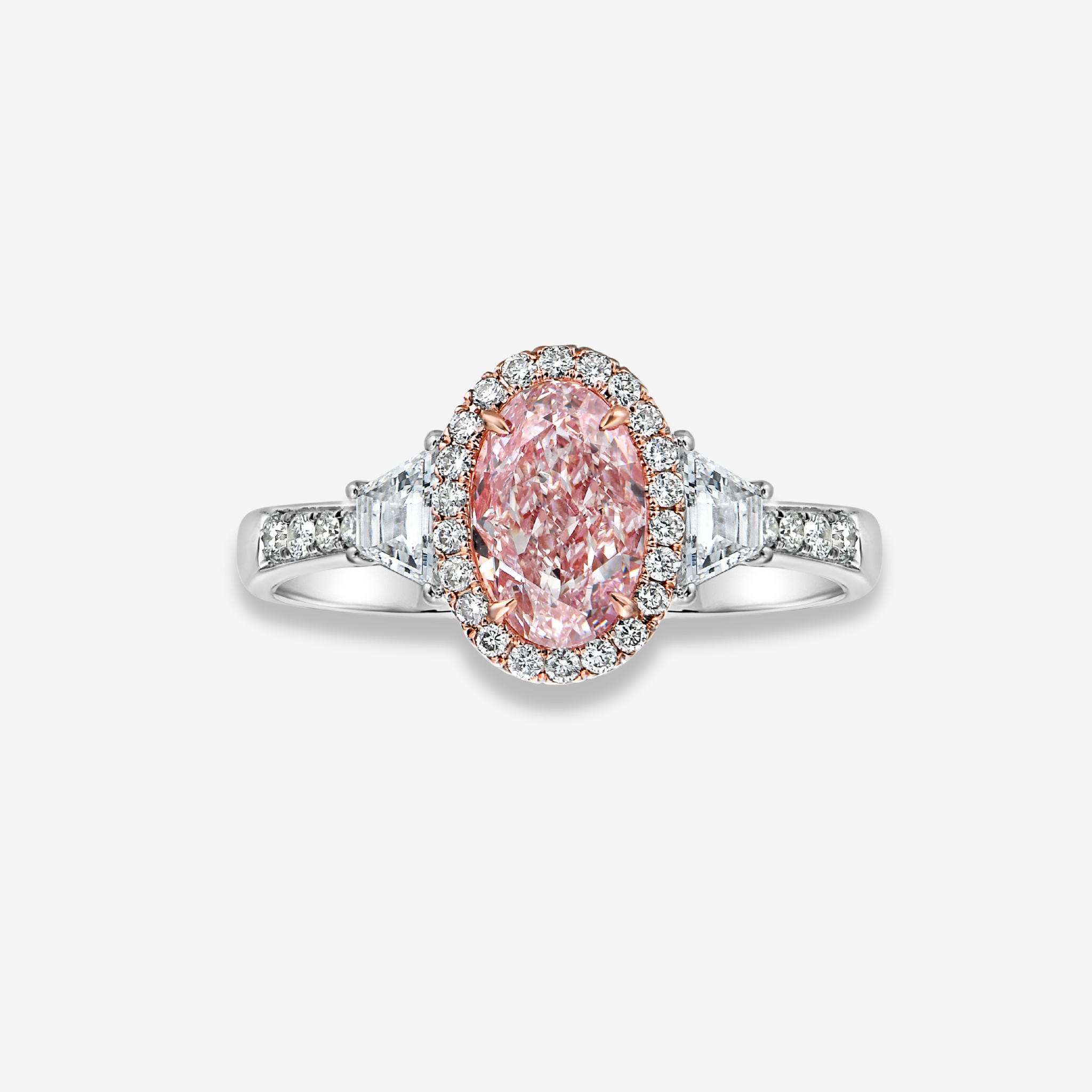 Exceptionally sweet pink oval diamond surrounded by a halo of smaller diamonds, creating a stunning visual effect and adding extra sparkle to the ring.